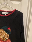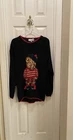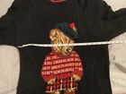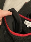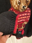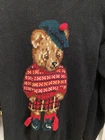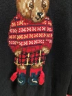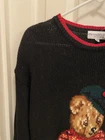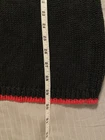 I love this sweater! It is a black knit sweater made of a cotton ramie blend. Red trim on neck and cuffs. Knit Scottish bear on front of sweater with pompon on hat and fringe on shoes. NICE condition! Approximate measurements are in the photos. Please review for an accurate fit.