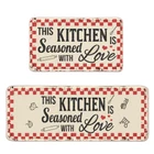 This kitchen mats set includes 2 floor mats: Measures 17" x 29" and 17" x 47", features 0.25" slim. Material: Made of 5% polyester and 95% rubber backing, which is not easy to fade and reliable to use. Durable and Non-slip : Backed with non-slip rubber and topped with polyester felt that is low-profile to reduce chances of tripping. Easy to clean: No scrubbing needed. Just spray off with a hose or use a sponge and mild detergent to clean off dirt. Awesome Kitchen Decor: These mats with funny quotes will make a beautiful addition to your kitchen, dining room, craft rooms and office spaces, as well as a perfect housewarming gift.