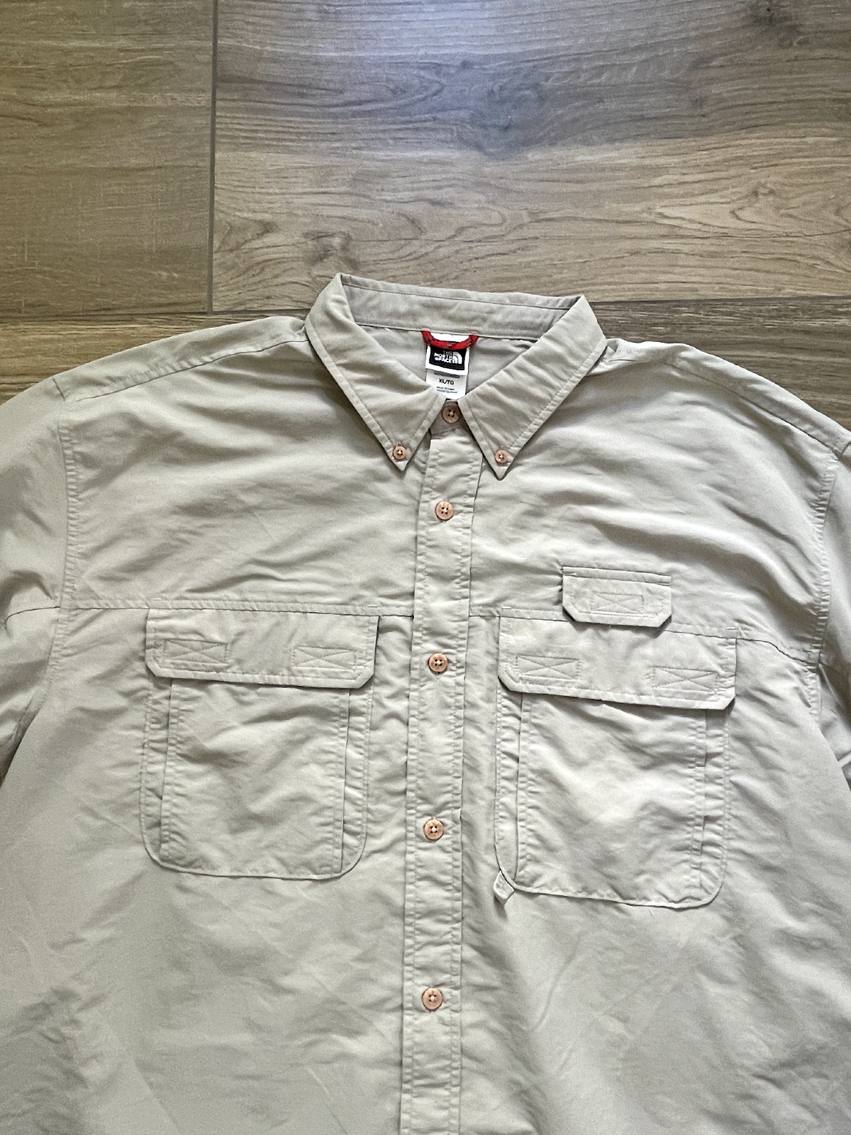 The North Face Roll Tab Vapor Wick Camping Shirt Style: Long Sleeve Button Up Features: Roll tab sleeves, button down collar, velcro close chest pockets, vented mesh back Color: Tan khaki Fabric: 73% Nylon, 27% Poly Approximate flat measurements: Pit to pit 26 1/2", Length back neck to hem 33", Sleeves 25" Condition: Preowned - no holes or spots Tag Size: Extra Large