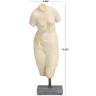 Modern accent statue is molded with polystone and placed on a rectangular base, ensuring it will stand the test of time. Washed cream home decor figurine showcases an abstract woman figure with no head, forearms, or legs below the knees, detailed with intricate textures and a rectangular base. Wipe clean with a dry cloth. This woman home decor statue can enhance any home room or office space, adding a touch of modern sophistication. Designed with felt or rubber stoppers at the base that prevent scratching furniture and table tops, as well as sliding around. This item ships in 1 carton. Please note that this item is for decorative use only. Polystone sculpture makes a great gift for any occasion. Suitable for indoor use only. This item ships fully assembled in piece. This is a single cream colored statue. Modern style. MODERN DECORATIVE STATUE: Inspired by sleek elegance and clean lines, a minimalistic design offers effortless luxury with monochromatic tones and bold, angular structures POLYSTONE SCULPTURAL ACCENT: Cream decorative sculpture is made of polystone, a material known for its durability and strength CREAM AND BLACK HOME DECOR FIGURINE: Asymmetrical decorative statue boasts a whitewashed cream finish that makes it look elegant and timeless, resting atop a sleek black base WOMAN ASYMMETRICAL ACCENT STATUE: This polystone sculpture features an abstract design reminiscent of the Italian marble masters of the Renaissance SMALL SIZE SCULPTURAL STATUE: The cream polystone sculpture measures 4.85L x 4.90W x 14.25H inches, and weighs 2.74 lbs