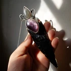 This one of a kind magical beauty features gem lepidolite, purple labradorite, on a obsidian arrowhead talisman for a magical queen, measures approximately 7-8" and hangs on an 18-21" stainless steel silver chain. Jewelry is handcrafted with led free silver solder with a method called tiffany technique, using black patinas and a final polish to create an antique ancient magical feel to it. A “stone of transition”, Lepidolite assists in the release and reorganisation of old behavioural and psychological patterns, gently inducing change. It brings deep emotional healing, soothing and reducing stress and depression. Lepidolite dissipates negativity and insists on being used for the highest good. It activates the throat, heart, third eye chakras and the intellect. It opens the crown chakra, clearing blockages and bringing cosmic awareness. Lepidolite facilitates astral travel and accesses the Akashic Record. It helps to take you forward into the future, tuning you in to thoughts and feelings from other lives that are creating a blockage in your life now. A stone of transformation, Labradorite is a useful companion through change, imparting strength and perseverance. It balances and protects the aura, raises consciousness and grounds spiritual energies. Excellent for strengthening intuition - promoting psychic abilities. Powerful in revealing the truth behind illusions, Labradorite banishes fears and insecurities, and strengthens faith in the self and trust in the universe. It stimulates the imagination and calms an overactive mind, developing enthusiasm and new ideas. Obsidian is truth-enhancing. A strongly protective stone, it forms a shield against negativity. It blocks psychic attack and absorbs negative energies from the environment. Obsidian draws out mental stress and tension. It stimulates growth on all levels, urging exploration of the unknown and opening new horizons. Brings clarity to the mind and clears confusion. Helps you to know who you truly are. Obsidian dissolves emotional blockages and ancient traumas. Promotes qualities of compassion and strength.