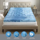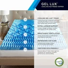 Rest in comfort every night with the 3" Cool GelLux Foam Mattress Topper by Henredon. Topper features a liquid, gel-infused foam that provides a cooler sleep surface. Patented GelLux technology combines the benefits of cooling gel with a responsive foam. The Tri-Zone wave and coil sculpted design promotes air flow and support where your body needs it most. 5 Year Limited Warranty. COMFORT & SUPPORT: Gel-infused foam provides ideal targeted support and pressure relief for aching lower back, muscles and joints. More responsive and stays cooler than traditional memory foams. Sleep Wave design reduces motion transfer, increases lumbar support and creates refreshing air flow channels. PROFILE: 3 inch height profile. COMPATIBILITY: Compatible with standard size bed-sheets, adjustable bases, memory foam mattresses, innerspring hybrid mattresses and more. SHIPPING/CONTENTS: One box shipping. Unwrap, unroll and relax. May take up to 24 hours to decompress to full mattress topper height. RETURNS & WARRANTY: Backed by a one year warranty. See return policy for details.
