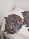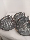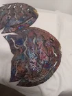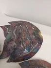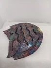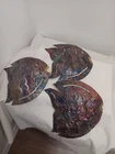Three Vintage MCM Brutalist Sheet Metal Fish Wall Hanging Art Sculpture Mexico. Approximately 15 cm (or 5.75") tall each. Missing their orignal stickers, which would have said: HECHO EN MEXICO. All in very good condition. Great additions to any collection or mid-century decor.