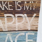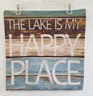 Lake Life Blue Decorative Throw Pillow Zipper Cover Square 17x17 NWOT Sofa Chair "THE LAKE IS MY HAPPY PLACE" Blue, brown, and tan weathered wood look on burlap type fabric. SEE PHOTOS FOR DETAILS.