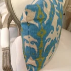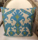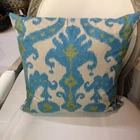 Decorative pillow in beautiful ikat pattern. Stunning. Turquoise and creme on heavy fabric. 22 x 22 inches Same fabric on both sides. Down insert is 10/90. Custom made for our store by professional seamstress. Invisible zipper makes cover removable. Condition: New Shipped FedEx Ground to lower 48 states.