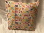 100% cotton throw pillow cover in off white with multicolored numbers on lined paper. Back is white with a pattern of multicolored berries and an envelope closing which makes it removable and washable. 14" x 14". Inside seams are serged so they don't ravel when washed. Pillow inserts (not included) can be purchased at Joanns Fabric Store for about $8.99 or much less if you have a Joanns coupon from their app.