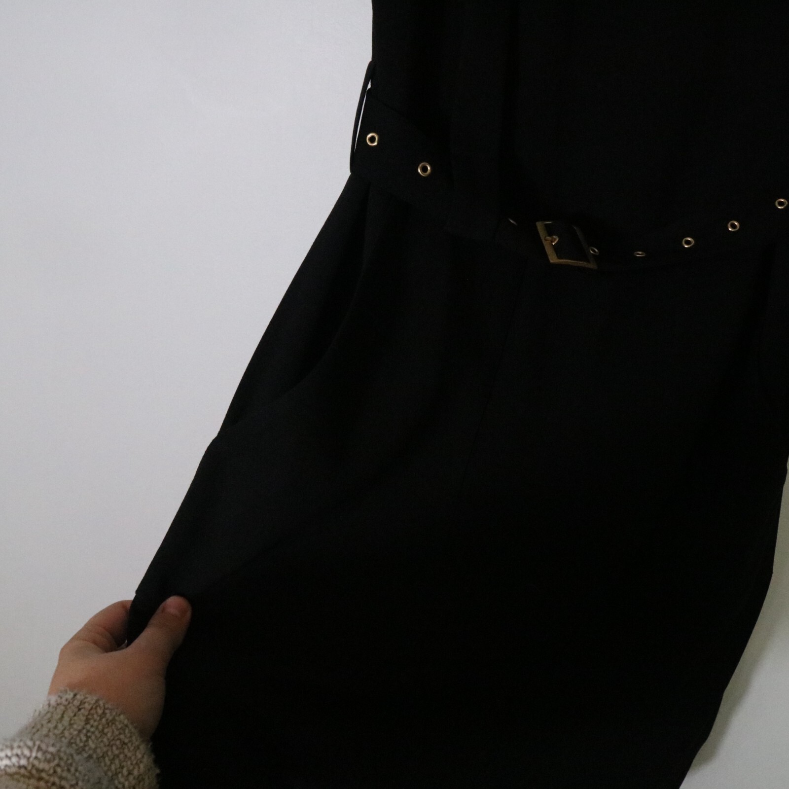 Tibi Belted Black Mini Dress Womens 4 V Neck Gold Grommet Neutral Dark Grunge bust 18 inches length 38 inches
