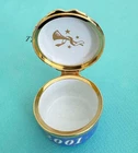 ** CELEBRATE THE SEASON....FESTIVE VINTAGE HOLIDAY MAGIC.... *Wonderful... TIFFANY & CO DESIGNED ARTISTIC... HALCYON DAYS ENAMELS 2001....With Baby CHERUB DRAPED IN GOLDEN RIBBONS PLAYING A GOLDEN HORN...CELEBRATION! CHRISTMAS...HAPPY NEW YEAR!...CHEERS! Artistic...Lovely Blue with Gold Stars, Ribbons, Creamy Light Cherub...Handsome Golden Metal Detailings... Golden Horn, Ribbons, Stars on inside lid... Year: 2001 on the side. HAPPY NEW YEAR! Printed on the Bottom of Small Trinket or Pill Box: HALCYON DAYS ENAMELS ENGLAND DESIGNED BY TIFFANY & Co. Enamel, Quality Hand Crafted, Hinged Small Round Trinket Box Made in England. Comes with Small T&Co Blue Box. NICE Pre-Owned Condition. Little Light wear. Hinge works fine...Closes well. **PLEASE see Photos above as part of the description. Porcelain Trinket Box only. (**No Presentation Box**) Carefully wrapped for shipping via Mail. No International Shipping. Shipping in US only. TY. Thank you for looking! * HAPPY ALOHA HOLIDAYS!*