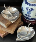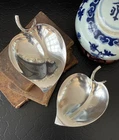 Here we have a marvelous rare example of a fully hallmarked traditional MCM American dual ball-footed sterling silver peach leaf form master bonbonniere salt caviar canapé serving dining dish vessel bowl pair #25053. This fine rare large scale 6” length, 4.35” width and 1.5” height example is manufactured and marked to verso by celebrated American maker Tiffany & Co, c1950-1960. A fine example of American MCM aesthetic, this scarce period matching two-piece master serving set is a stunning and stylish example to own and enjoy. In quality heavy gauge sterling silver, this marvelous period American heritage showpiece is sure to delight every admirer when featured on display or for use. The condition is excellent. The patina boasts a warm sterling silver luster. This scarce gallery quality item has a glorious look and feel to treasure for generations. 7.639 ozt. Endless possibilities. Display ready.