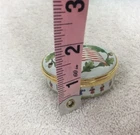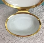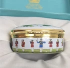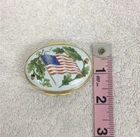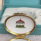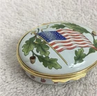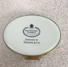 This elegant trinket case is a stunning collaboration between Tiffany & Co. and Halcyon Days, featuring a beautiful American flag design with luxurious gold trim. Perfect as a decorative piece or for storing small treasures, it comes with its original booklet and is in excellent used condition with only minor wear. The craftsmanship is impeccable, and the rare design makes it a true collector's item. A must-have for anyone who appreciates fine, authentic details!