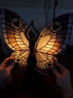 Tiffany Style Table Lamp Fairy Angel Stain Glass Wings, snapped at waist appears to be a clean cut/break & glue able, minor chipping throughout (nothing major), wings are missing 1 bracket to mount to the fairy & a couple inches of glass that goes around bracket. Great project for someone that knows how to fix it, otherwise she is a beautiful piece! Bulbs are included, she is approximately 15" tall & 8" width, selling as is, as pictured, no returns. Shipped USPS will purchase extra insurance for shipping
