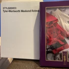 Tonner Tyler Wentworth 1/4 "Weekend Retreat" 16" Doll Outfit 20833 from 2000 is a fashion doll clothing set designed for adult collectors. The set includes a multicolor sweater, coat/jacket, top, pants, shoes, socks/tights, tote bag, sunglasses, and accessories. It is part of the Tyler Wentworth Collection, featuring the character Tyler Wentworth in everyday and seasonal clothing styles. Made of hard plastic and cloth materials, this limited edition outfit is suitable for 16-inch fashion dolls.
