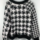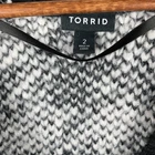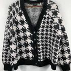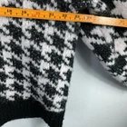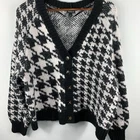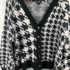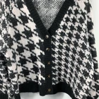 This Torrid cardigan is a cozy, casual piece in a size 2 with a black and white houndstooth pattern. It features a V-neckline, long raglan sleeves, and a button front closure. Made from a blend of poly, acrylic, nylon, and wool, this relaxed-fit, collarless cardigan is perfect for casual, workwear, or business settings. It has a classic and preppy style, suitable for all seasons.