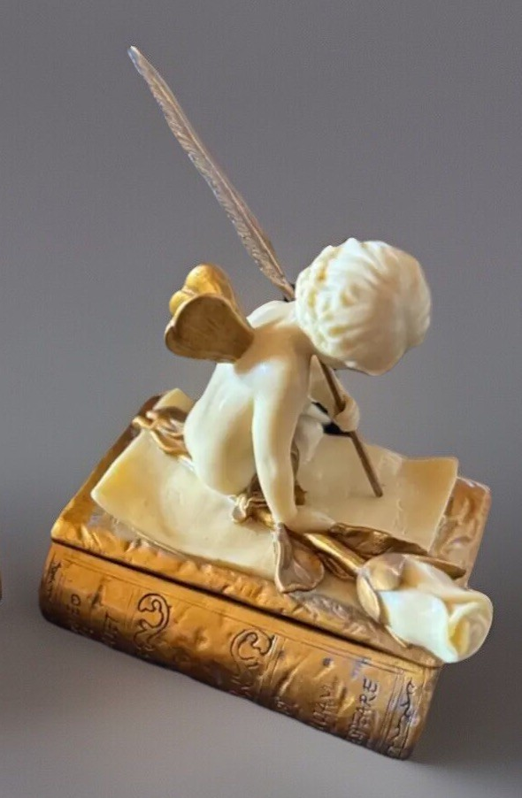 Charming and detailed Design Toscano "The Love Letter" Cherub Trinket Box . Features an angelic figure seated on a book, writing a letter with a feather quill. This sculptural keepsake box is beautifully hand-painted with an antiqued finish. Perfect for: Jewelry Rings or small notes Romantic decor Collector of angels, cherubs, or baroque-inspired pieces Features: Lid lifts to reveal hidden compartment Sculpted from cold-cast resin with hand-painted detail Approximate size: 4.5" L x 4" H (check and confirm if needed) Design Toscano brand – known for artistic home décor Condition: Pre-owned, excellent condition. No chips, cracks, or repairs. Light wear to base. Clean and display-ready. Makes a beautiful gift or elegant addition to any dresser, altar, or curio shelf . Ships securely with padding and care.