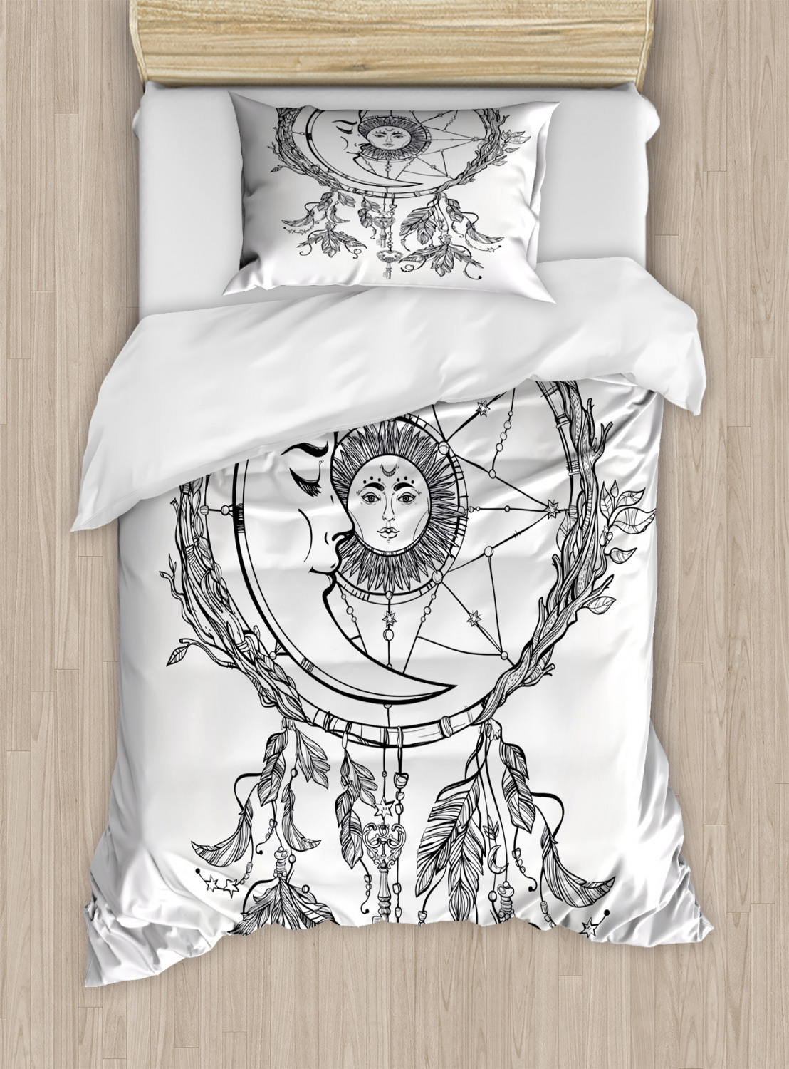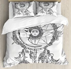 Tribal Duvet Cover Set King Size Asian Dreamcatcher Moon with 2 Pillow Shams Time to embrace modern looks, feel-good fabrics, and high-quality materials! King, queen, or twin - these 3 pcs duvet cover sets will work in any bed for any season! Woven from 100% brushed microfiber fabric, our duvet cover collection is constructed for maximum strength and ultra comfort only for you and your beloved ones. All you need to do is to simply put our duvet cover on your comforter and secure it with zipper closure, and enjoy your new bedding set! MEASUREMENTS: KING SIZE SET: Duvet Cover (104" W X 88" L) and 2 Pillow Shams (36" W X 20" L). QUEEN Size Set: Duvet Cover (88" W X 88" L) and 2 Pillow Shams (30" W X 20" L). Twin Size Set: 1 TWIN Duvet Cover 68" X 88" + 1 Pillow Sham 30" X 20". The duvet cover FEATURES hassle-free hidden zipper and the pillow shams have an envelope closure. Please note that COMFORTER NOT INCLUDED IN THIS SET. This only duvet cover, allowing you to protect the comforter/duvet insert from dust, mites, and other stains. WRINKLE FREE - The microfiber material creates ultimate softness and comfort, also provides wrinkle, fade, and shrink resistance when properly cared for. Very durable and sustainable material that will not endanger your health or the environment, either. No chemicals used, No dye substance harming the health of you or your family, %100 microfiber recyclable environmentally friendly fabric. LOW MAINTENANCE: Machine washable in cold water. Suitable for tumble dryer use on low heat. Can be ironed on medium heat when necessary. Do not bleach. Choose your style between thousands of different and creative patterns. Or simply find your perfect gift idea ever for housewarming, birthday, bridal shower, Christmas, Mother’s Day, and newlyweds… You can find a theme for everybody and every interest in our Ambesonne Store. The images we display have the most accurate color possible but, due to differences in pc monitors, there can be slight color differences between the product and the image. Due to manual measurement, please kindly allow 1-2 cm discrepancy. The Duvet Cover and Pillow Shams are printed on the FRONT SIDE ONLY, the back of them are PLAIN WHITE-COLORED. This is ONLY the Duvet Cover, sold WITHOUT the Comforter.
