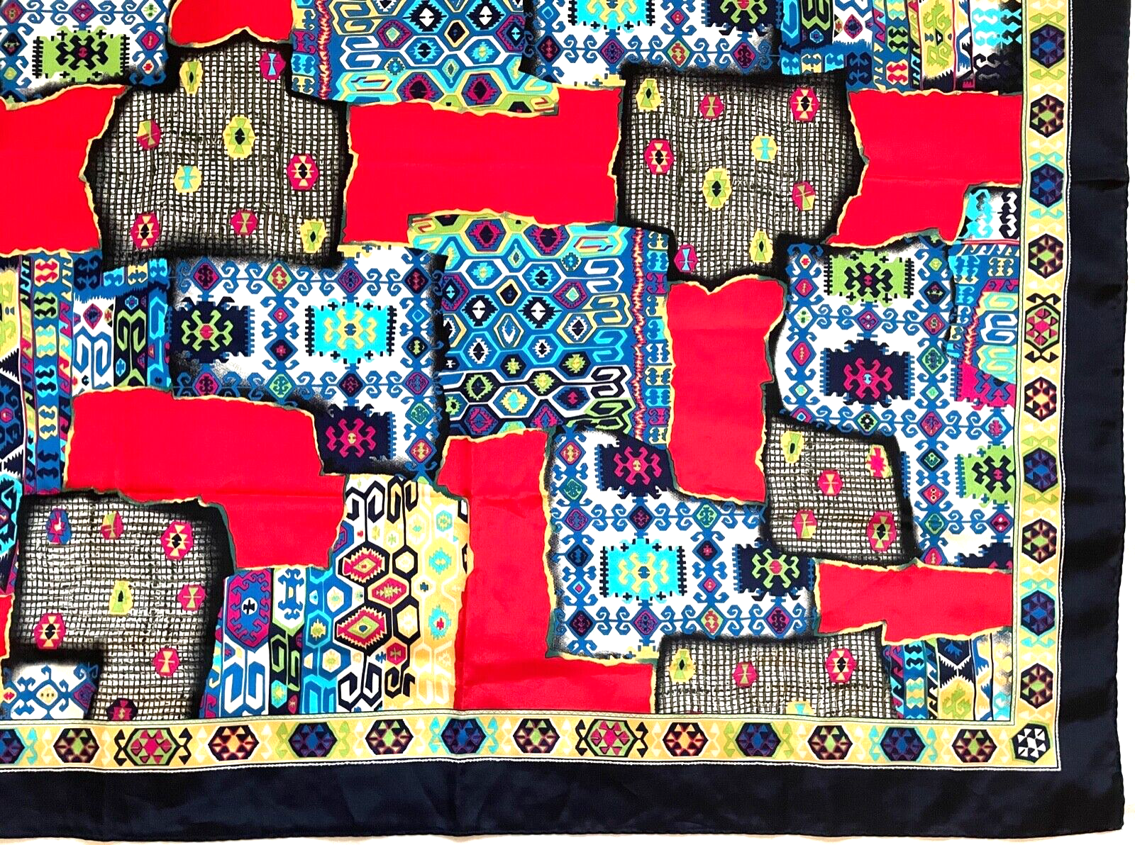 PATCHWORK Oriental Carpet ABSTRACT Floral Geometric Red Blue Silk Fashion Scarf PATCHWORK Oriental Carpet ABSTRACT Floral Geometric Red Blue Silk Fashion Scarf Description Perfect accessory for this season! A captivating explosion of color and pattern, this pure silk scarf brings together tribal flai r and modern edge in a striking patchwork-style design. Featuring a rich tapestry of vibrant geometric prints over a bold red background, it’s both wearable art and a collector’s gem. Perfect as a neck scarf, head wrap, or statement accessory, the smooth silk and hand-rolled edges make this piece as luxurious as it is eye-catching. Design: Patchwork mosaic with ethnic/geometric motifs Color Palette: Red, Blue, Yellow, Green, Black Material: 100% Pure Silk Finish: Hand Rolled Edges Size: Approx. 33" x 34" Condition: Excellent – no stains, damage, or discoloration Tags: Removed Payment We accept only payment within 3 days! Shipping We will ship your item by International Priority Mail. We would be happy to combine shipping, the final shipping cost depends on weight, the extra shipping price is 1.5$ for each additional scarf. The return is free in case of not as described item and the shipping fee is shared if the buyer simply change hers/his mind. About Us Our items have been previously owned, they may not be perfect. If there are any major flaws they are mentioned in the description above. All of our items are cleaned and come from a pet free and smoke free house. Please take a moment to browse our listed items; we have a variety of scarves in different styles, colors and designers. We have a 1 business day handling time. Five stars positive feedback is highly appreciated. In case you are not satisfied please contact us before leaving feedback to solve the problem. Thank you for looking & bidding! Track Page Views With Auctiva's Counter