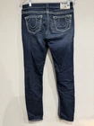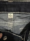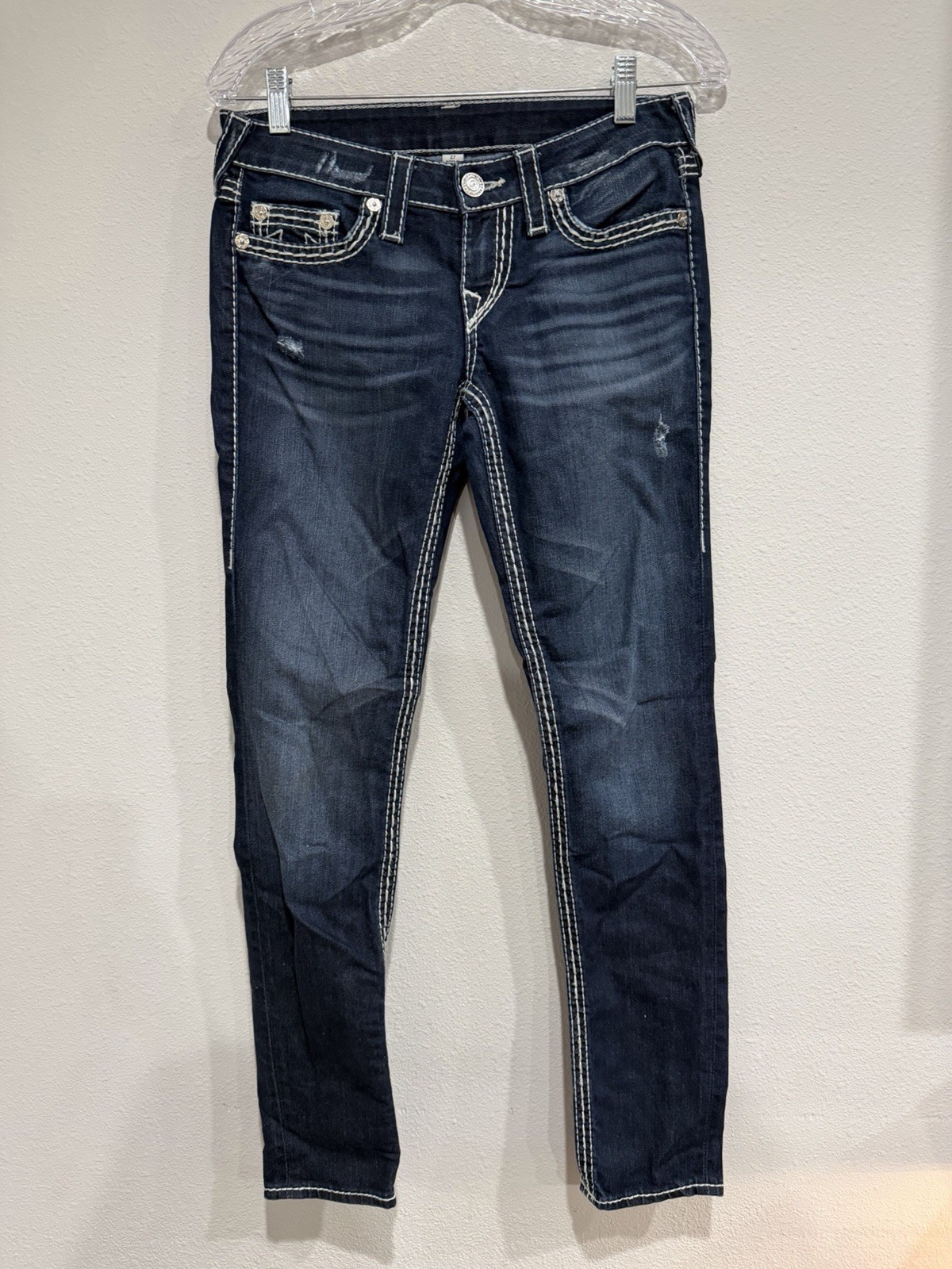 These True Religion Women's Jeans in size 27 feature a dark wash skinny fit with a low rise and no flap design. Made from a blended fabric with a stretch denim construction, they offer a comfortable and flattering silhouette. The jeans showcase a 5-pocket design with stitching accents and a zip and button closure. Perfect for any season, these jeans combine style and functionality, making them a versatile addition to any wardrobe. The iconic True Religion brand and signature logo give these jeans a touch of luxury and American flair.
