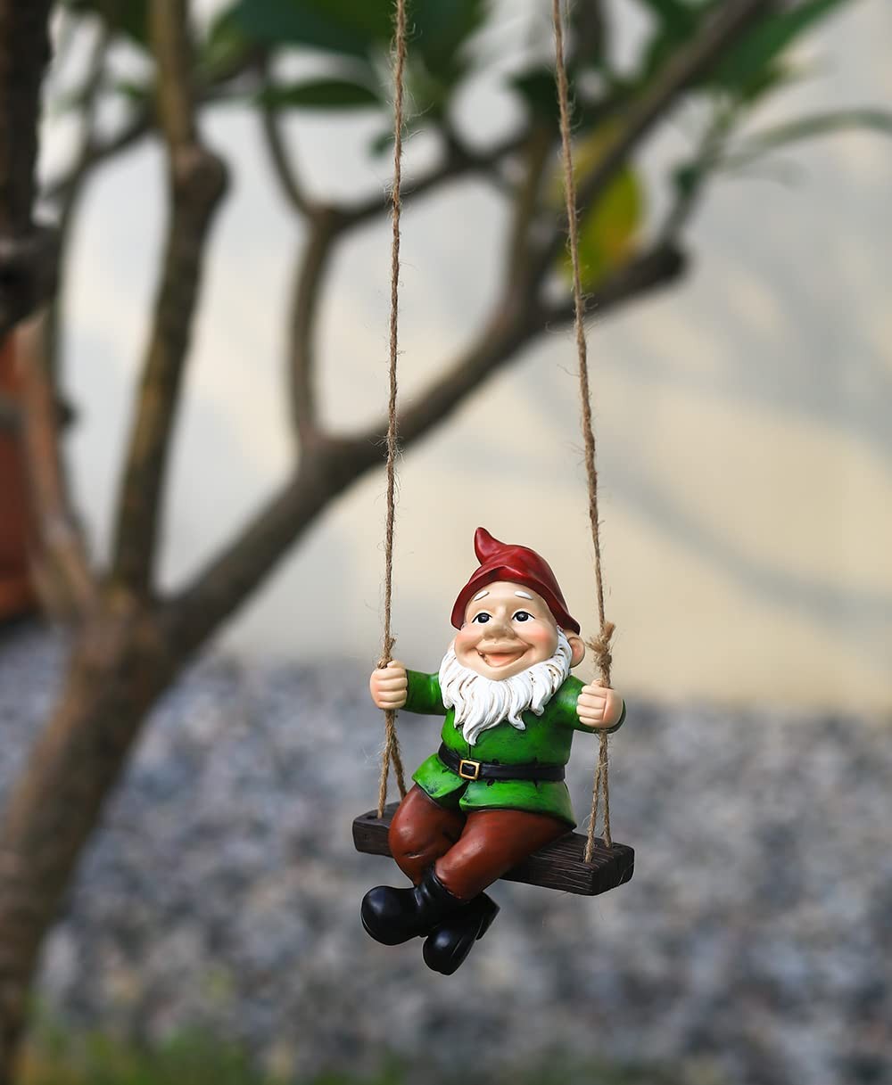 Features: 1. Made of high quality resin,handmade,hand painted, brightly colored. . 2.It is coated with resistant material and durable for all kinds of weather conditions. 3. A lovely gift for dwarf lovers,friends, and families. 4. Funny gnome on a swing and enjoy his pleasant time. 5. Suitable for both indoor and outdoor such as garden, patio, lawn, yard, porch, front door and many areas. Specification: Material: Resin Size: 21cm x 13cm x 10cm/8.3" x 5.1" x 3.94" Color: Red,Green,White,Yellow,Brown Weight: About 453 g Package Included: 1 * Garden Gnome Statue 【Lovely Garden Gnome】This cute little gnome sitting leisurely on a swing, smiling and staring ahead,enjoying the pleasant time in the afternoon.It is made of resin material,hand painted in natural color. 【Size and Weight】The size of the gnome is 21cm x 13cm x 10cm/8.3" x 5.1" x 3.94".Weight:1 pouds.A nice size makes this dwarf look more conspicuous. 【Multiple Applications】Put this funny gnome into your garden, lawn, porch, yard, patio, trees,front doors,and many other places,making your your life more beautiful. 【Easy to Hang】We have prepared 2 sturdy ropes for hanging this dwarf. You can hang this dwarf on a tree, by the window in your home, or anywhere else suitable for hanging. 【Ideal Gift】A good gift for families, friends,, gnome lovers,kids on birthday,Father's Day, Mother's Day, housewarming, Valentine's Day, Christmas, Anniversary, etc.