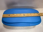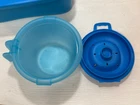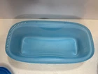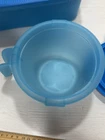 This Tupperware Microwave Pasta Maker is a blue steamer with a capacity of 1.9 liters. It can be used for cooking spaghetti and rice in the microwave. The set includes a lid and the item dimensions are 11 3/4" in length, 6 1/4" in width, and 4 1/2" in height. It is an original Tupperware product, model number 6775, made in the United States.