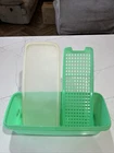 This vintage Tupperware storage container set is a must-have for any kitchen! The set includes 9 items, with a variety of shapes and sizes to fit all your storage needs. The containers are made of durable plastic and feature a solid green color, with a retro/vintage style that adds a touch of charm to your kitchen. The set includes a lettuce crisper, veggie crisper, bread container, grater, and strainer, as well as lids with an airtight seal to keep your food fresh and easy to clean. These containers are an original Tupperware product, made in the United States, and are in excellent condition. Don't miss out on this unique and practical collectible! Please note any imperfections, discoloration, scratches, etc. in the photos. Will provide more photos upon request. Listing 1499