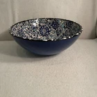 This Turkish ceramic serving bowl features a hand-painted floral motif in blue, white, and black colors. The round bowl has a diameter of 8.25 inches and a height of 3 inches, making it a decorative and functional piece for serving food. With a vintage style and contemporary design, this art pottery piece from the 1990s is a unique addition to any table setting, showcasing traditional Turkish craftsmanship and a floral theme. The brand is Turkish, and the bowl is made of ceramic, weighing 1.5 lbs. Excellent condition. No chips or cracks.