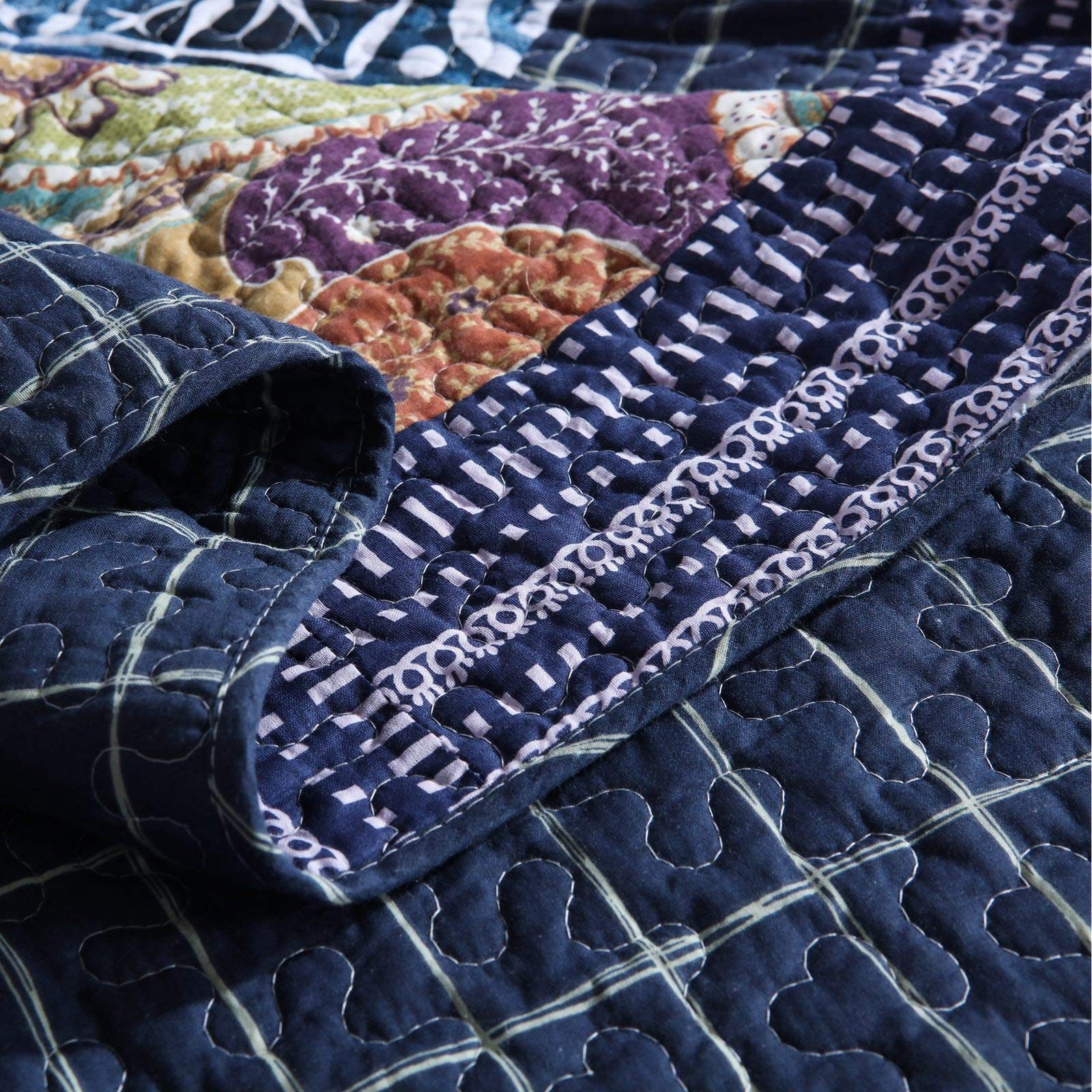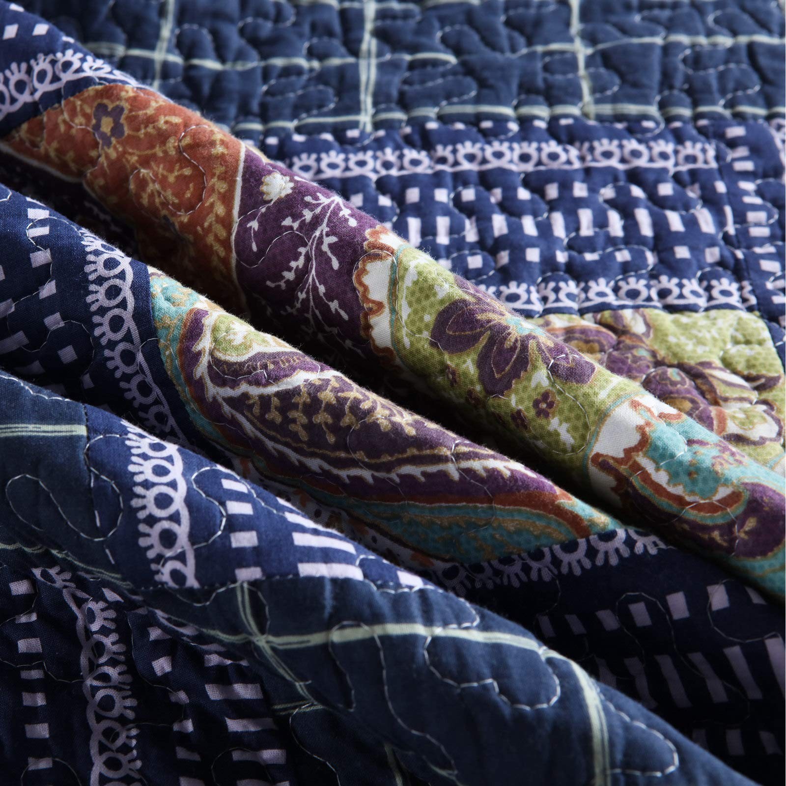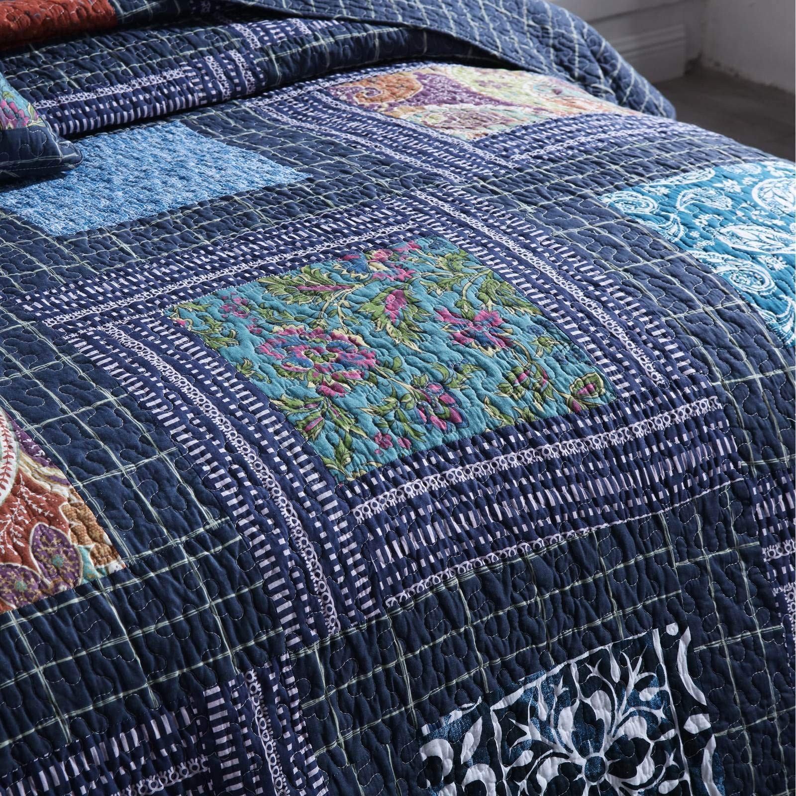 Original Cotton Patchwork Quilt Twin Size Quilted Throw Blankets for Couch Sofa Reversible Vintage Floral Paisley Navy Bedspread Coverlet Lightweight Bed Throws for Bed Home Bedroom Decor 💧PREMIUM MATERIAL - Cover: 100% cotton. Filler: 100% cotton. Using soft and breathable cotton, make the quilt blanket more durable and comfortable through all the season, yet lightweight. 💧SHABBY CHIC STYLE - Vintage/old fashioned floral print and gorgeous paisley quilt with unique patchwork crafts. Super soft cotton to create a lightweight, durable quilt blanket for year-round comforts. It is lightweight enough to carry from room to room, but heavy enough to keep you warm and comfortable. 💧QUILT SIZE - 59’’x79’’ (150 x 200 cm), perfect to be used as bed throws, quilted blanket for couch, sofa, chair, swing and daybed, or just as a home decoration. 💧UNIQUE DESIGN - Practical reversible design, both sides can be used individually. The beautiful colors and embroidered stitching is perfect to add lovely texture to your home. 💧CARE INSTRUCTION - Machine wash in cold water, gentle cycle, tumble dry low or sun dry. No Chlorine bleach or any additives. 💧【Note】Due to the design of vacuum packaging, the twin size quilt will have wrinkles, which can be restored by leaving it for a while or washing it.