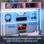 【Stylish & Functional Grid Design】The U shaped office desk combines style and functionality with a unique grid design. the under-grid bookshelf maximizes space utilization, providing storage for books, devices, and more. enhance organization and room aesthetics with this modern furniture addition. 【Multi-functional U Shape Gaming Desk】This versatile computer desk features an ergonomic display stand and a side display storage rack, as well as 4 handy fabric drawers to meet your many needs. The top hutch design provides ample space for files, books, and supplies, creating a functional workspace for gaming and work tasks. three wide desktops offer plenty of surface area for various activities. 【Dynamic RGB LED Lighting】 Enjoy the smart app and ir remote control over the RGB LED strip lights, offering 60,000 colors and dynamic modes for customized aesthetics. the music sync feature changes colors with the music rhythm, creating an immersive gaming or working environment. set automatic on/off schedules for added convenience. 【Enhanced Ergonomics & Power Support】 A flexible monitor stand promotes ergonomic sight levels, reducing neck strain. the U shaped desk features 4 power outlets and 2 USB ports for convenient device charging, offering extra power support for computer peripherals, gaming gear, and more during work or play sessions. 【Robust Construction】This U-shaped desk features sturdy construction with thick engineered wood and solid metal legs, offering an excellent load-bearing capacity of up to 600 lbs. Durable and stable, this desk ensures long-term reliability for gaming setups and workstations. Product Description Storage Bag Storage Shelf Built in Power Strip 4-Drawer Design