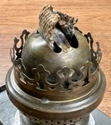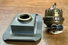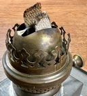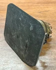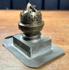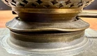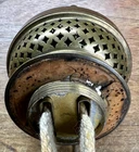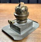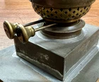 Offering a truly unique DUPLEX lamp burner with tin fount pot and base. This dual-wick lamp does not show a manufacturer as far as we have seen. Because of its base, we believe it would have been slid inside of some type of lantern, but we can't say for sure. This burner and fount pot measure approx. 4 1/2 inches tall and 4 inches long, including the wick adjustment knobs. The tin base measures approx. 6 3/8 inches long by 4 5/8 inches wide. This is in good used condition with light wear from age and handling. It shows some light scuffs from age, use, and handling and natural discoloring which enhances the patina. The burner has not been cleaned and has some residue from use. Please examine our photos and ask any questions prior to use.