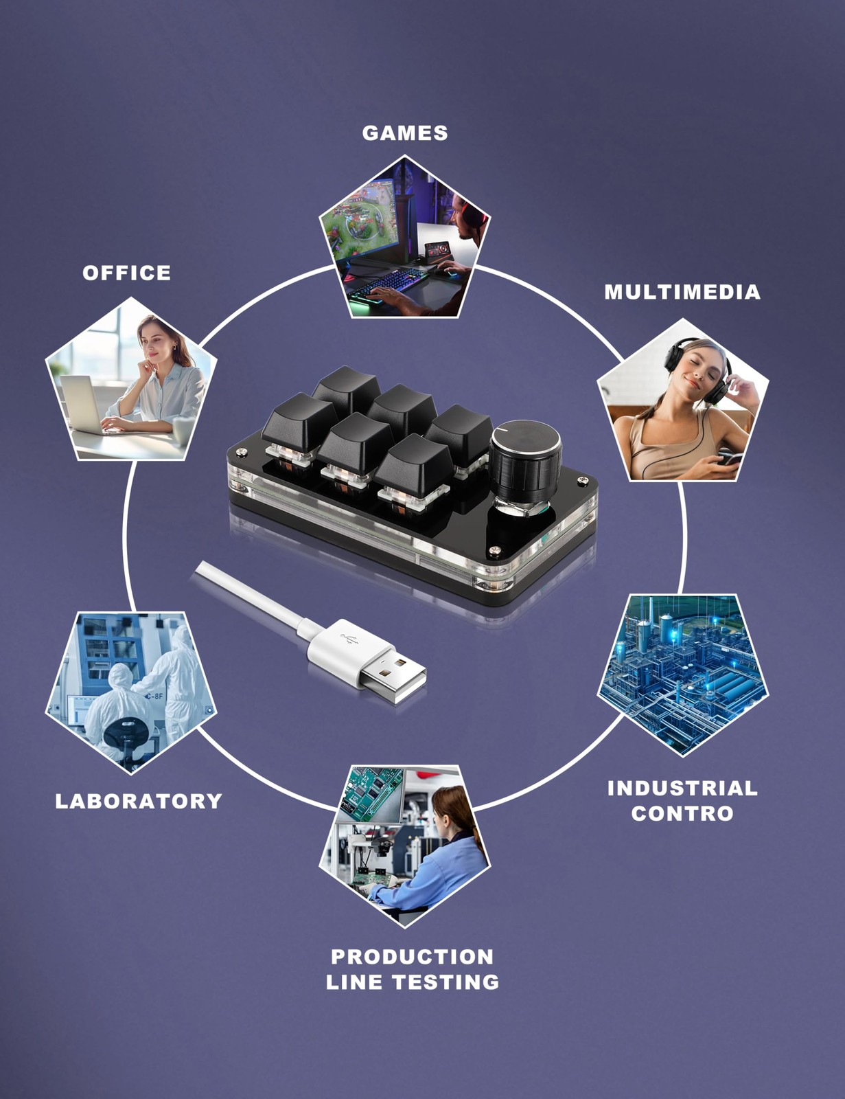 pecification: Item Type: Mini Keypad Material: Acrylic, PCB Application: Suitable for office, game, music, media, industrial control, laboratory, production line testing and other fields System Support: For , for VISTA, for Linux, for OS X Button Life: Up to 50 million times Type: blue switch Number Of Keys: 6 key Size: Approx. 102x57x38mm/4.02x2.24x1.50in Current Voltage: DC 5V/1A Operating Temperature: -10℃ to 50℃ Software Download: (1) Link: https://pan..com/s/1kTURFONFa28VJac_mK1E7w Extraction code: 6688; (2) Download link on official website: http://www.videyt.com Package List: 1 x Mini Keypad1 x USB Cable Note: Tips: This software can only be run on for system temporarily, as far as possible to download on computer PC, set the software to install, open the can be run directly, will automatically be stored in the chain plate set, again to support usb protocol such as for Linux, use on for OS X systems (note that antivirus software to release for the first time, set the trust file)!! Data cable random (white or black) 【SHORTCUT】: All key functions of the standard for keyboard can be set to achieve complex combination of shortcut keys with one key. 【STORAGE FUNCTION】: One handed keyboard with storage function, after being set up for , macro keyboard can be used for Linux, for OS X and other systems that support USB protocol. 【KNOB FUNCTION】: Knob can be set to zoom in and out, switch to the next song, volume up and down, pause, play and other functions, more effective. 【MATERIAL】: Mechanical gaming keyboard is made of acrylic and PCB material, wear high strength. 【EASY to Use】USB keypad, easy to use, Type C to USB interface, no driver, just plug and play, portable and lightweight, convenient and practical.