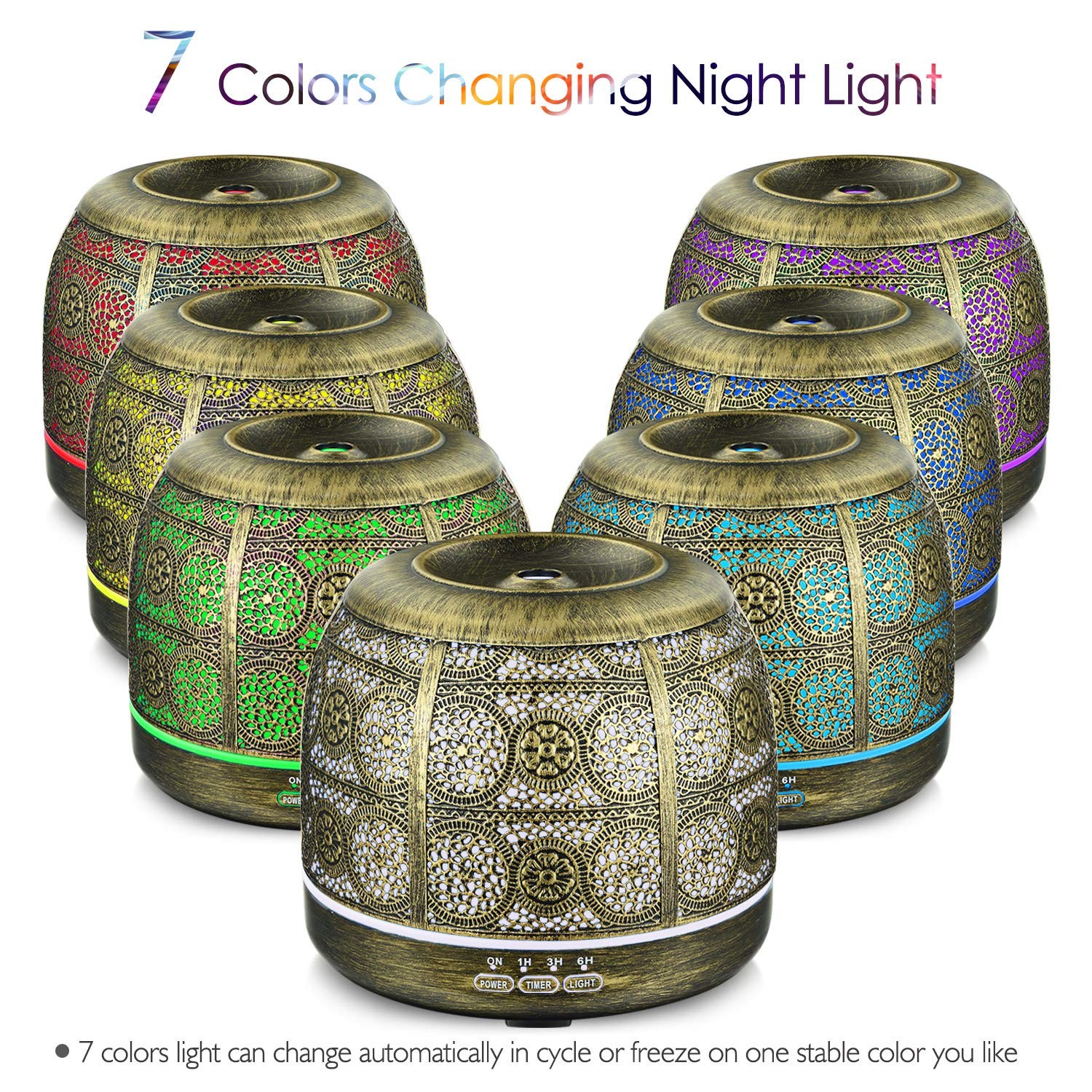 ARVIDSSON 500ml ultrasonic diffuser for essential oils provides a customized aromatherapy experience with an elegant Moroccan design that will elevate any home décor. With longer run times and various light modes, this diffuser will let you experience essential oils in a whole new way. Ultrasonic Cool Mist Technology: Experience the benefits of ultrasonic cool mist diffusion with our BPA-Free oil diffuser. It provides a safe and effective way to enjoy your favorite essential oils, ensuring a healthy environment for all family members, including pets and children. Timer Setting & Auto Shut-off: Our 500ml metal oil diffuser has the timer setting for 1 hours, 3 hours and 6 hours, that allows you to set how long your diffuser will run. The diffuser will turn off automatically when end to the timer or run out of water, so you can use it anytime. Customizable Ambiance with Multi-Color Lighting: Tailor your aromatherapy experience with a variety of LED light colors. Create the perfect atmosphere for relaxation, focus, or meditation, with the option to change the lighting to suit your mood. Low Noise Operation: The ultrasonic frequency generates waves at 2.4 million times per second with a lower noise operation, releasing essential oil molecules into the air to help create a relaxing, spa-like atmosphere in your home or office.
