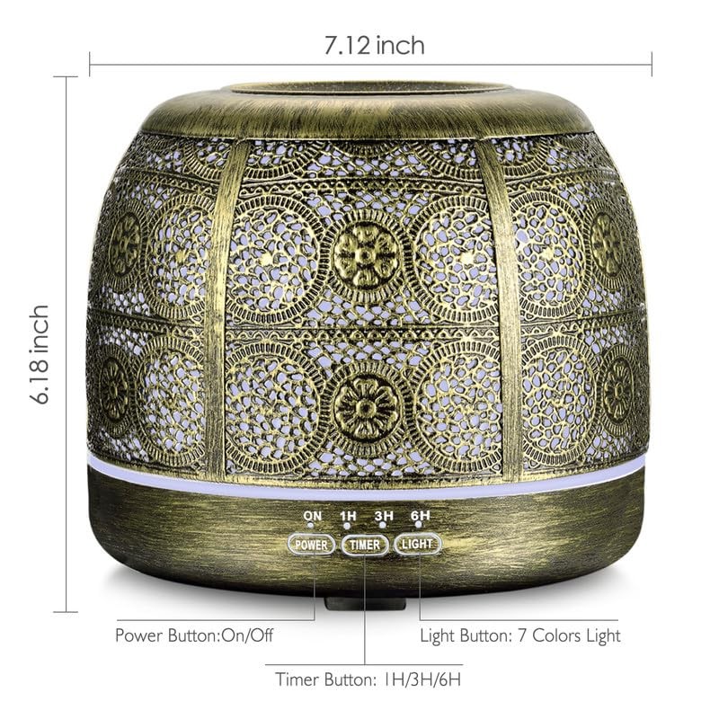ARVIDSSON 500ml ultrasonic diffuser for essential oils provides a customized aromatherapy experience with an elegant Moroccan design that will elevate any home décor. With longer run times and various light modes, this diffuser will let you experience essential oils in a whole new way. Ultrasonic Cool Mist Technology: Experience the benefits of ultrasonic cool mist diffusion with our BPA-Free oil diffuser. It provides a safe and effective way to enjoy your favorite essential oils, ensuring a healthy environment for all family members, including pets and children. Timer Setting & Auto Shut-off: Our 500ml metal oil diffuser has the timer setting for 1 hours, 3 hours and 6 hours, that allows you to set how long your diffuser will run. The diffuser will turn off automatically when end to the timer or run out of water, so you can use it anytime. Customizable Ambiance with Multi-Color Lighting: Tailor your aromatherapy experience with a variety of LED light colors. Create the perfect atmosphere for relaxation, focus, or meditation, with the option to change the lighting to suit your mood. Low Noise Operation: The ultrasonic frequency generates waves at 2.4 million times per second with a lower noise operation, releasing essential oil molecules into the air to help create a relaxing, spa-like atmosphere in your home or office.