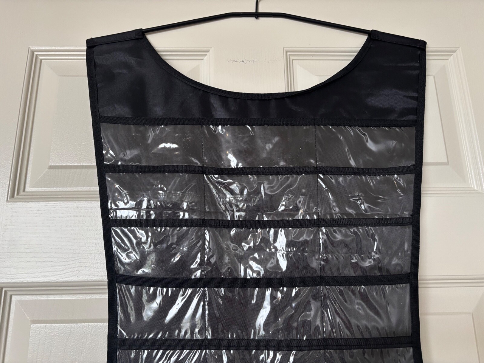 For sale is an Umbra Matt Carr Little Black Dress Jewelry Hanging Organizer. This amazing Storage Hanger stores jewelry on both the front and back of the hanger, with velcro hangers on one side and plastic pockets on the other. It makes it easy to find jewelry and other items, and is essential for organizing and locating these items. Sturdy and of high quality. Please see photos for details.