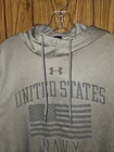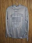 This Under Armour hoodie is a must-have for any activewear collection. Show your support for the United States Navy with the bold graphic logo on the chest. The hoodie is made of high-quality materials to ensure maximum comfort and durability. The gray color is versatile and perfect for any outfit, while the accents of the logo add a unique touch. This hoodie is perfect for women who enjoy an active lifestyle and want to stay comfortable while showing their pride in the Navy.