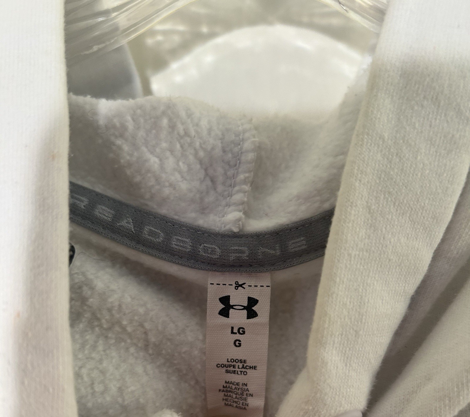 Stay warm and stylish with this Under Armour Women's UA THREADBORNE FLEECE GRAPHIC HOODIE. The hoodie comes in a beautiful White Gray color with a graphic pattern that adds an extra touch of style. The pullover closure and hooded neckline make it easy to wear and perfect for outdoor activities. Made with high-quality fleece material, this hoodie provides ultimate comfort and warmth. The long sleeve design and semi-fitted fit make it perfect for gym and training sessions. The hoodie features a logo accent and is part of the Threadborne product line. Available in size L, this hoodie is a must-have for any activewear collection.