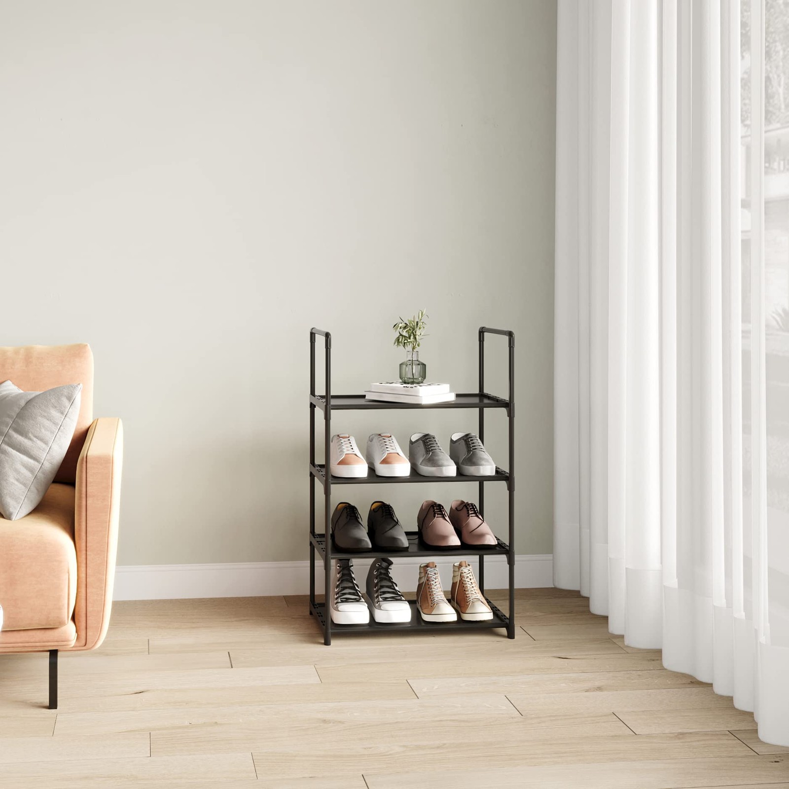 Upgrade Stackable Small Shoe Rack, 4-Tier Shoe Shelf Storage Organizer with Handle for Entryway, Hallway and Closet (Black) 【Upgrade with Handle】 Stores up 8-10 pairs of shoes for men, women,kids with Handle easy to move.This stackable shoe rack is not only for shoes, It could be a display stand for your bag,books, plants and more.It also works great for kitchen food containers storage.This storage rack is a perfect choice for renters. 【Stackable Design】The 2 sets can be stacked into 8 layers, and the two sets of the same four-layer without handle can only be spliced to 7 layers. And ordering multiple stacks won't waste layers. 【Space Saving】The toddler shoe rack for entryway with standard size of 17.3" W x 11.4" D x 28.8" H, A good solution to keep your entryway, closet, dormitory, patio, mudroom and garage away from messes. 【Adjustable】The simple structure and light weight make the rack very convenient for you to assemble and disassemble. You can also remove the layer to fit boots, high heels or larger accessories. 【Stable Material】Made from waterproof non-woven fabric tiers , Strengthened plastic connectors and thickened alloy steel .Waterproof and oilproof, sturdy. 【Easy to Assemble】Installation requires only a few easy steps and no special tools are needed.You only need a few minutes to get a vertical shoe rack.