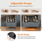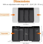 Utensil Organizer for Kitchen Drawers, Expandable Cooking Utensil Tray, Adjustable Cutlery Silverware Flatware Holder, Plastic Kitchen Spatula Tools and Gadgets Storage Divider, Large, Black Specific Uses For Product Utensils Material Plastic Special Feature Expandable, Adjustable Color Black Brand Lifewit Product Dimensions 15"D x 13"W x 2"H Shape Rectangular Number of Items 1, with 5 Compartments Maximum Organization: Featuring 3 large compartments (13.4"L × 3.5"D) and 2 expandable slots on the side (14"L × 4.7"D), this utensil organizer offers ample space for storing most cooking utensils in the kitchen, such as spatulas, ladles, tongs, utensil sets, and whisks. Expandable and Adjustable: The utensil organizer for kitchen drawers can be expanded from 3 slots to 5 slots, offering extra storage space for utensils. It is adjustable to fit different drawer sizes, ranging from 13 to 22.4 inches wide. When folded, it measures 13" x 15" x 2", but expands to 22.4" x 15" x 2" for added space. Safe to Use: Crafted from BPA-free PP material, this cutlery drawer organizer guarantees the safety of all your utensils, silverware, and flatware. Cleaning is a breeze as well - simply rinse with water to remove stains. User-Friendly Design: With its solid bottom panel, attached dividers, and sturdy support frame, this cooking utensil organizer ensures that your utensils do not slide under the dividers. The curved grooves ensure convenient access to utensils, while the unique edge design allows for effortless movement. Efficient and Versatile Storage: This 5 compartment flatware organizer for drawer categorizes and neatly stores utensils, making it easy to pick up what you need. Not only for kitchen utensils, it can also be used in drawers in other rooms to store various small items.
