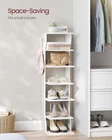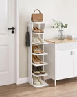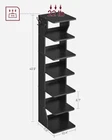 About this item [Fits Tight Spots] Shoe storage in the doorway? Trinkets or plants display in the narrow hall? Wherever storage is needed, this 11.8"D x 10.4"W x 43.5"H shoe tower will fit the bill while taking up little floor space [Hang Accessories Up] Hang your keys and wallets on the hooks of this corner shoe shelf for a quick grab and go during the morning rush. Even better, the 2 hooks can be installed on the left or right as you need [Holds Taller Shoes] Loafers, sneakers, hiking shoes, boots...all of them can be well accommodated on the shelves with 6.7 inches between each, tall or short [Offers Strong Support] Crafted with particleboard, this corner shoe rack boasts great strength (max. 22 lb load for each shelf), so you can set heavy climbing shoes on with ease [What You Get] A 7-Tier slim shoe rack with backboards to add stability and protect your wall from scuffs, plus an anti-tip device to help you secure the shoe tower to the wall for safety