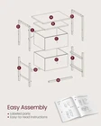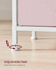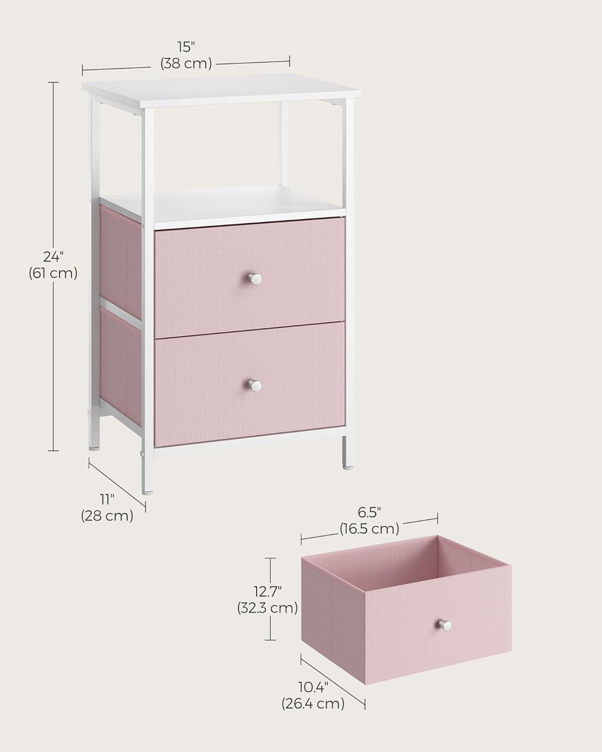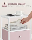 VASAGLE Nightstand, Side Table 1 Pack with Double Drawers, Jelly Pink + White Product Details Brand: VASAGLE Product Dimensions: 11"D x 15"W x 24"H Maximum Weight Recommendation: 100 Pounds Color: Jelly Pink + White Recommended Uses For Product: End table, Bedside table, Storage in hallway Item WeightFrame Material: 10.4 PoundsMetal Top Material TypeShape: Ash WoodRectangular [Everything by Your Side] Perch your lamp and clock on the top, store books in the middle shelf, and stash cables and remotes in the drawers—this side table with 2 shelves and 2 drawers offers tons of storage for you, from open storage to closed storage [Serve Many Places] Make it an end table next to the couch in the living room, a bedside table in the bedroom, or add handy storage in the hallway—this table rounds off your space in any way [Sturdy & Stable] Made with particleboard, a steel frame with an X-bar, a durable non-woven fabric drawer, and balanced by 4 adjustable feet, this end table offers firm, stable, and lasting support [Adorn Your Space] Featuring jelly pink drawers plus white shelves and a white metal frame, this industrial-style side table brings a touch of charm and novelty to your home [Easy-Peasy Assembly] With easy-to-follow instructions and labeled parts, you can assemble this bedside table before you know it
