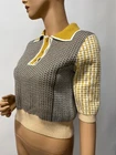 VC-RUAN STU-DIO Cropped retro Style Size Small is a women's sweater made of knit fabric with a collared neckline and short bell sleeves. The pullover features a geometric pattern in multicolor and a button accent. It is a classic fit and is available in size small. The sweater is machine washable and made of polyester.