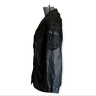 This leather coat is so cool! Vintage as anything, black leather with a paisley-floral style embossed detail around the yoke or shoulders. This does have shoulder pads. It's in very good condition with just a few light spots on one side (puctured)pictured. They are present but not easy to see. Please note that the fit is Oversozed, so the shoulders are bigger and the sleeves a bit shorter. Approximate measurements: Chest - 23" Length - 31" Sleeves - 19" Shoulders - 26" Around the hips area is about 21"