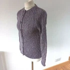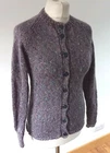 Gently used vintage condition with no faults found. Cardigan in a soft yarn with purple as main colour but also other colours running through it. Higher neck. Measures 18" pit to pit, 16" across hip area approx, , length nape to hem 25" with a bit of roll up at the hem, sleeve 24". Unsure of yarn content but is soft and has some mohair in it.