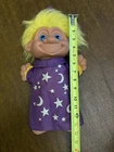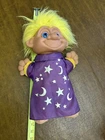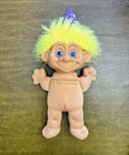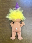 This vintage Toymax troll doll is a must-have for any collector. With its yellow straight hair and blue eyes, this gender-neutral doll is sure to catch your eye. The doll comes with an outfit and hat, perfect for any occasion. Measuring at 14 inches, this original troll doll is made of hard plastic and cloth materials. Its unique wizard troll character design is perfect for any fan of the Troll franchise. Don't miss out on the chance to add this rare piece to your collection. Note: Item has some light marks on the sleeves and hands; shown in photos! Item is clean! No stains. No odor, No damage! The voice box and waist drawcord of outfit is missing! Thank you for stopping by!
