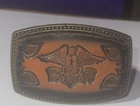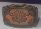 This vintage Alumaline belt buckle features a Honda Goldwing logo on a leather background, embodying a 1980s rockabilly motorcycle theme. The bronze metal buckle was made in the United States, showcasing an original design perfect for motorcycle enthusiasts.