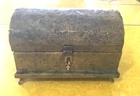 Brass metallic leaf design hinged treasure chest 8”x 5”x5”One hinged needs repair. I put a piece of copper wire thru to stabilize.Lining is worn.