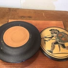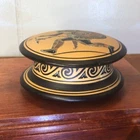 This vintage Greek pottery ceramic trinket box/jar is handmade and numbered in Greece. Made with traditional craftsmanship, it embodies the heritage and artistry of Greek pottery. Perfect for storing small treasures or as a decorative piece, this unique item showcases the beauty and skill of Greek ceramics. Measurements: 5.8 oz., 3.5” diameter at base, 2.25” diameter at open rim, 1.25” depth
