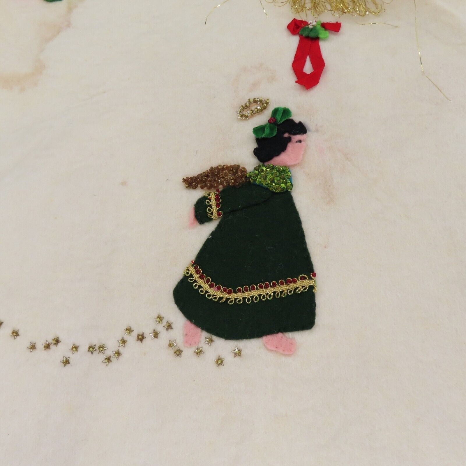 Vintage handmade felt tree skirt Diameter: 37" **measurements are approximate, taken with item laying flat Condition: used, surface wear/stains throughout- see photos, smoke free home Please review all photos closely as these will be the best description of the item. Thank you for shopping!