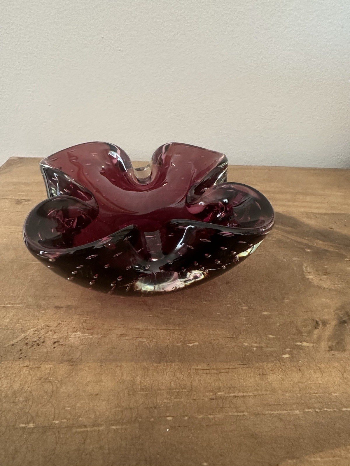 This vintage Murano art glass trinket dish/ashtray is a stunning piece that will add a touch of elegance to any room. The cranberry red color and controlled bubble technique make it a unique and eye-catching item. Handmade in Italy with hand-blown glass production techniques, this decorative bowl is a true work of art. Perfect for all occasions, it is a great addition to any collection or as a standalone piece. No chips or cracks