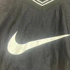 This vintage Nike windbreaker jacket is a stylish addition to any casual outfit. The black jacket features a big center check pattern, embroidered accents, and a relaxed fit. The jacket is made of softshell fabric with a polyester lining and insulation material. It has a full zip closure with a zipper and a band collar style. The jacket is lightweight and suitable for all seasons, making it perfect for summer and spring. It is machine washable and easy to maintain. The jacket is available in XL size and is a unit type jacket. The Nike brand logo is prominently displayed on the jacket, making it a great choice for gym and training activities. MC-17-88