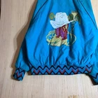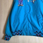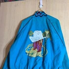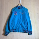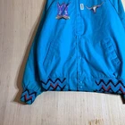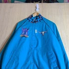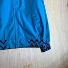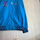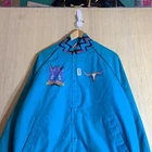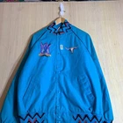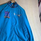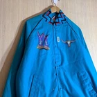 This vintage Western cowboy jacket is a must-have for any fashion-forward man. The blue jacket features a solid pattern and is made of cotton canvas with a nylon lining. It has a full zip closure and is lightweight, making it perfect for any season. The jacket is XL in size and has a regular fit. It is a bomber style jacket with embroidered accents and a logo. The jacket is perfect for any occasion, whether it's for travel, parties, work, or formal events. The jacket is a true representation of Western style and is a perfect addition to any wardrobe.