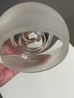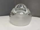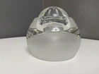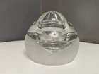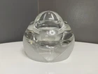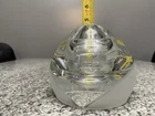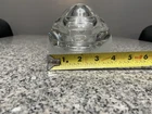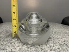 This vintage mid-century modern table top oil burner is a unique addition to any collection. Made of heavy glass, (maybe crystal?) it serves as a sturdy paperweight and is perfect for outdoor entertaining. The clear glass design allows for a variety of decor styles to complement it. Wick included. Needs metal piece to hold up wick. Please review all photos for condition & measurements